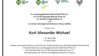 Der Landesjagdverband Rheinland-Pfalz e.V. trauert um den LJV-Ehrenpräsidenten Kurt Alexander Michael, der in den Morgenstunden des 09. April 2026, kurz vor Vollendung seines 77. Lebensjahres verstorben ist.
